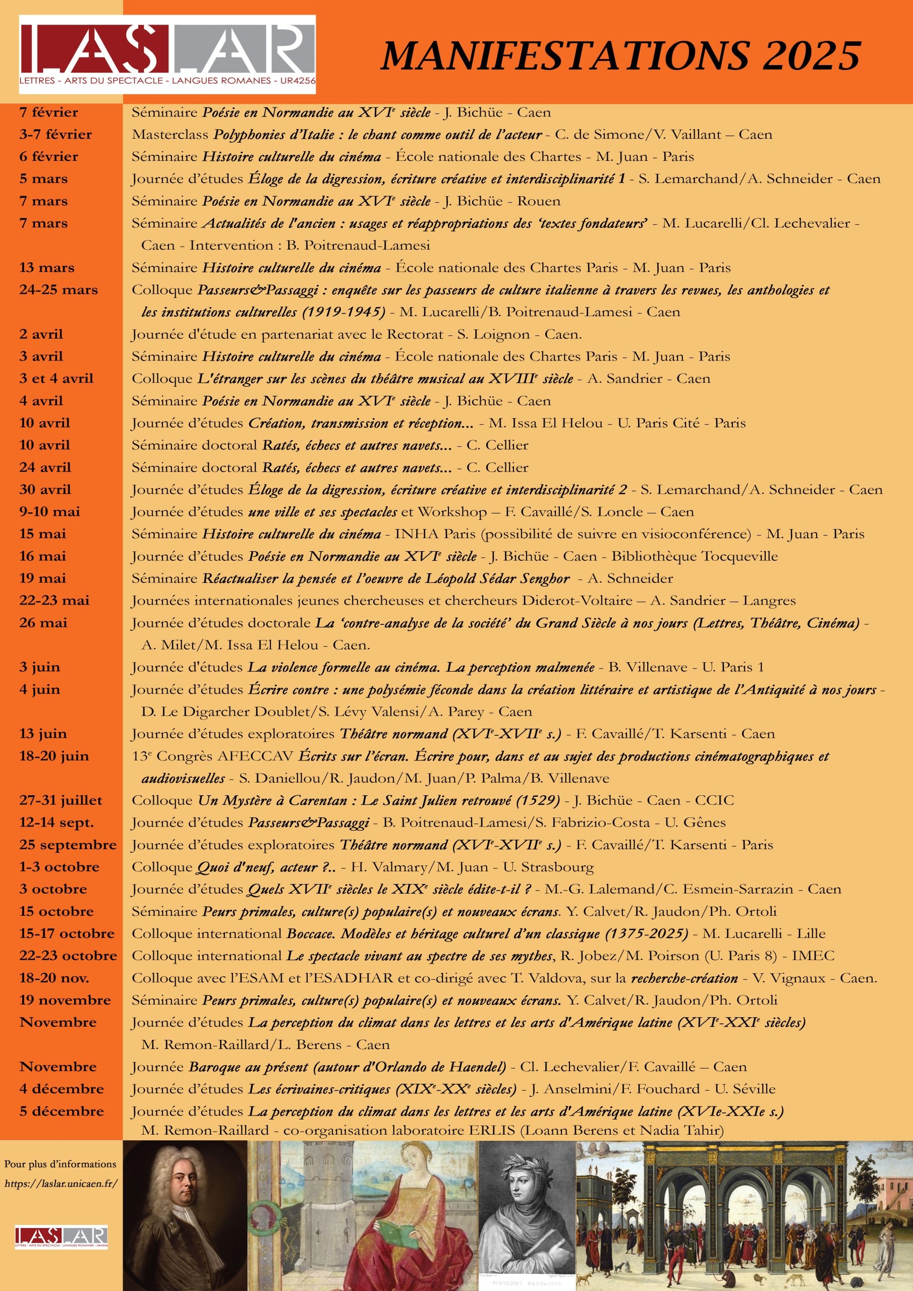 L’unité de Recherche LASLAR – « Lettres, Arts du Spectacle, Langues Romanes » – a été créée à l’université de Caen Normandie et habilitée en 2008. Son domaine de spécialité concerne les œuvres, les pratiques, les institutions littéraires, spectaculaires et plus largement artistiques. Le laboratoire constitue aujourd’hui une structure interdisciplinaire en Lettres et Arts telle qu’il n’en existe ni à l’université de Caen Normandie, ni dans le périmètre normand. Les chercheurs réunis au sein du laboratoire travaillent selon quatre approches épistémologiques, à travers l’analyse :